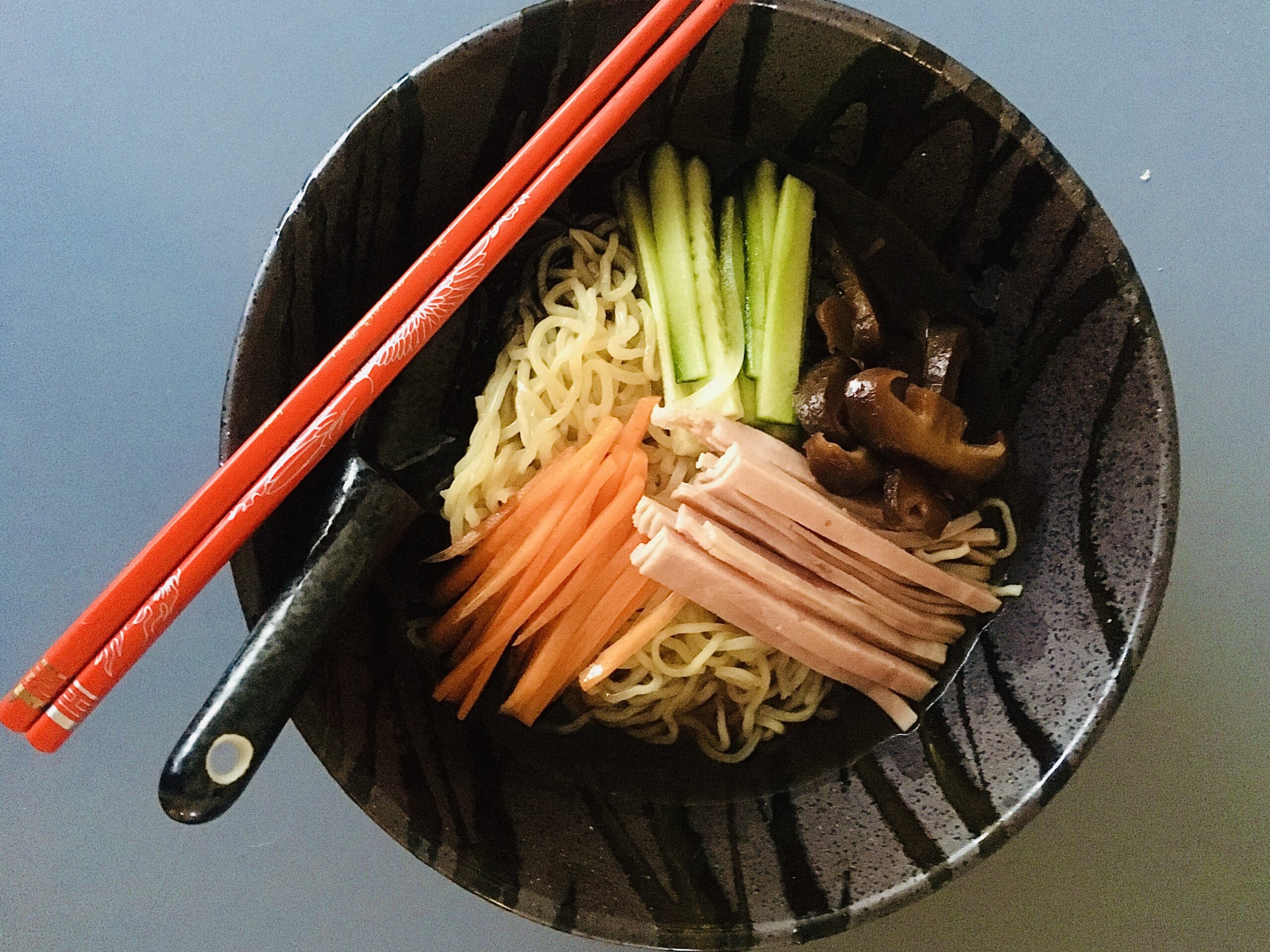 - ved servering laves en skål med de kolde nulder samt de grønsager du ønsker, det kan være tyndt skåret agurk, skinke, gulerødder, kina radis eller hvad du har i køleskabet, det er en lækker og fris sommerret til varme dage.